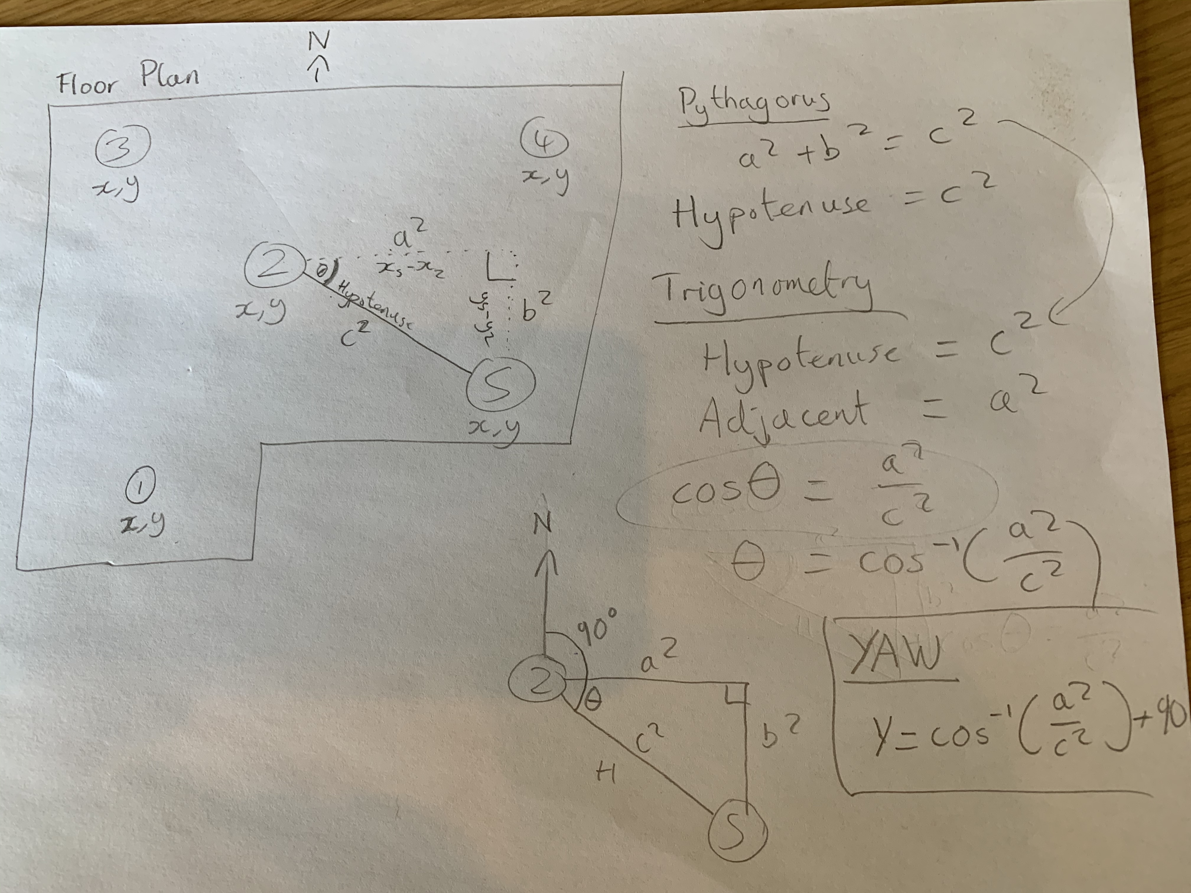For each scene we would plot a line between the current scene's coordinates and every other scenes' coordinates. We would use these lines as the hypotenuse of a triangle and measure the angle between the hypotenuse and the closest cardinal direction (north, east, south, west) from the current scene. We would then calculate the angle relative to north (as opposed to east, south or west) and use this measurement as the Yaw value of each hotspot.